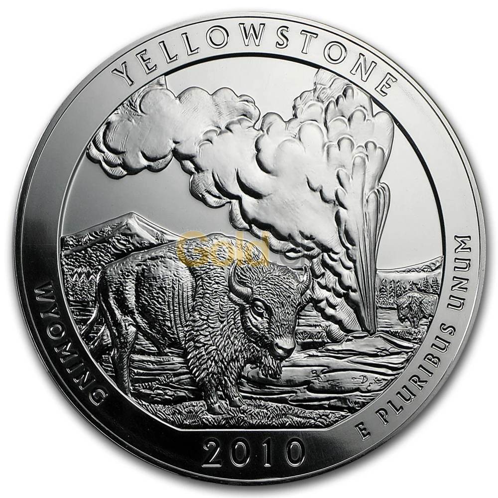 Wohl einer der bekanntesten Nationalparks ist auf der zweiten Ausgabe der Münzserie „America the Beautiful“ zu sehen. Der Yellowstone Park liegt in drei Bundesstaaten, zum größten Teil in Wyoming. Vor den ausgestoßenen Dämpfen der Geysire (u. a. des „Old Faithful“-Geysirs), des dort schlummernden Vulkans, ist eines der amerikanischen Nationaltiere zu sehen: der Bison. Auch hier kommen die Initialen „DE“ vor.