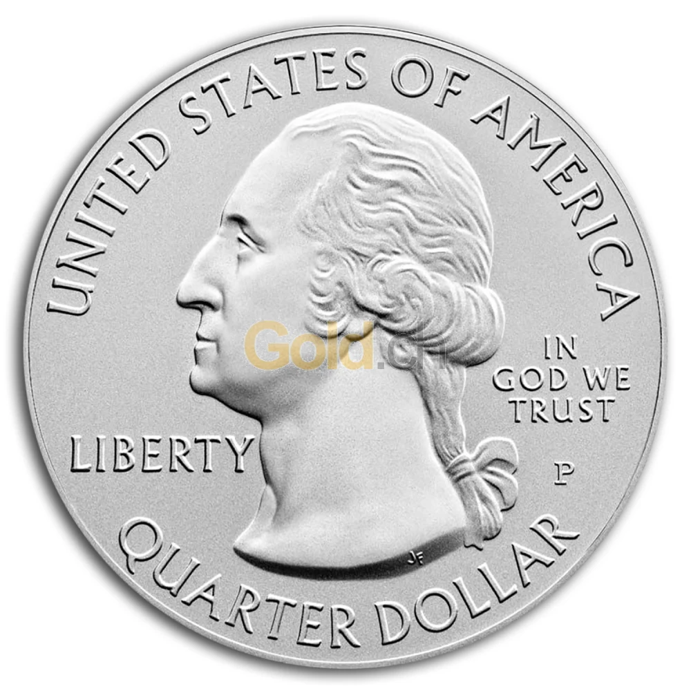 Die Vorderseite ist mit dem Porträt des Gründervaters George Washington versehen. Am oberen Rand der Münze verläuft der Schriftzug „UNITED STATES OF AMERICA“. Am unteren Rand steht der Nennwert „QUARTER DOLLAR“. Links neben George Washington ist der amerikanische Grundwert abzulesen: „LIBERTY“ (Freiheit). Rechts ist die Devise der USA zu sehen „IN GOD WE TRUST“. Das Porträt des ersten Präsidenten hebt sich schlicht vom glänzenden Hintergrund der Münze ab.