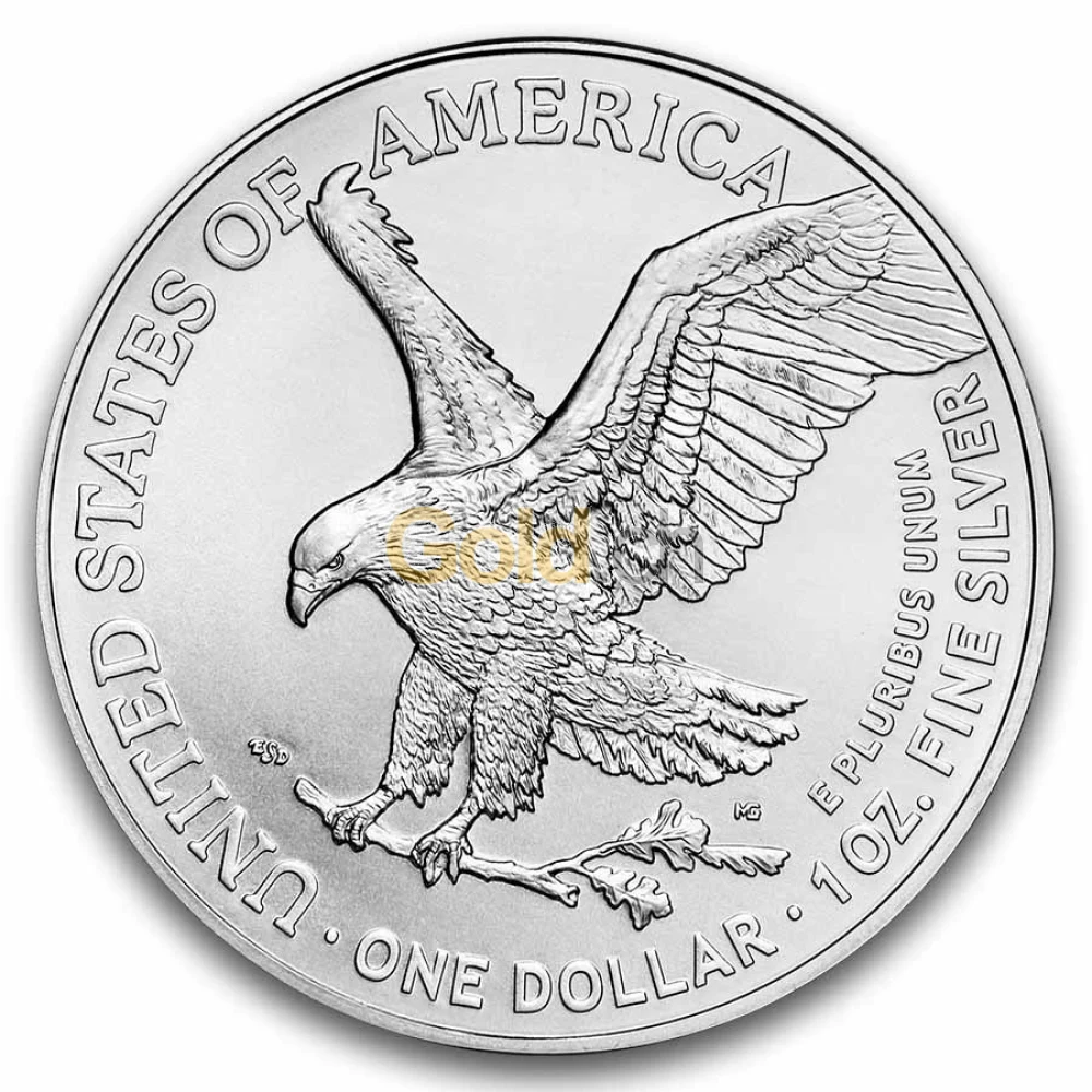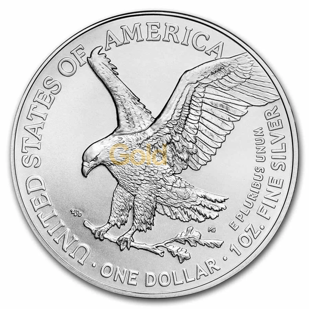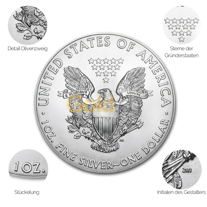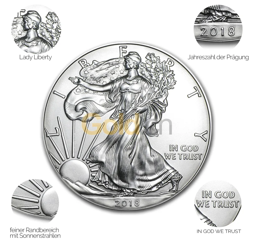 Die Silbermünze „American Silver Eagle“ zeigt auf der Vorderseite eine zum Sonnenaufgang schreitende Lady Liberty. Auf der anderen Münzseite ist ein Wappen der Vereinigten Staaten von Amerika vor einem stilisierten Weißkopfseeadler zu erkennen.