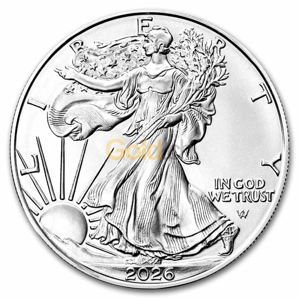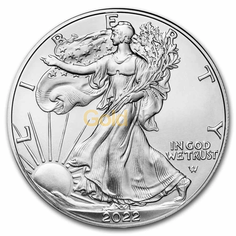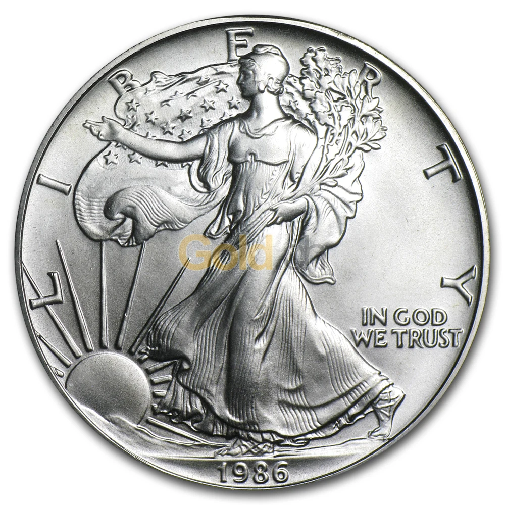 Die Silbermünze „American Silver Eagle“ zeigt auf der Vorderseite eine zum Sonnenaufgang schreitende Lady Liberty. Auf der anderen Münzseite ist ein Wappen der Vereinigten Staaten von Amerika vor einem stilisierten Weißkopfseeadler zu erkennen.