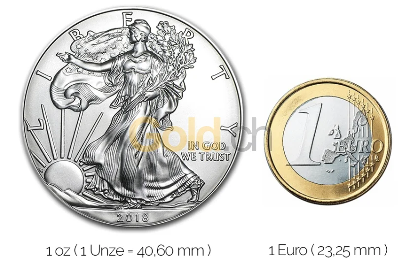 Größenvergleich American Silber Eagle Silbermünze mit 1 Euro-Stück