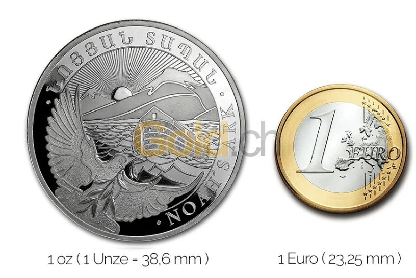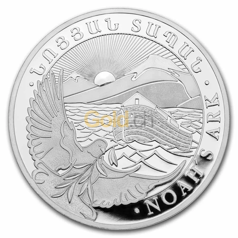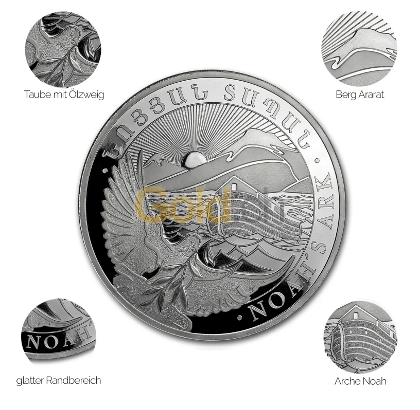 Die Silbermünze „Arche Noah“ erschien erstmals im Jahre 2011 als reine Anlagemünze. Im Jahre 2017 erschien ebenso eine limitierte Gedenkmünze in Gold. Trotz ihres armenischen Nennwerts von 500 Dram bei einer Feinunze Silber, stammt sie aus dem Hause der Leipziger Edelmetallverarbeitung. Diese erhielt die Prägerechte von der Nationalbank Armeniens, um die Silbermünze mit biblischem Motiv zu prägen. Auf dem Silber, mit einem Feingehalt von 999/1000, ist die Arche Noah und auf der Vorderseite das armenische Wappen zu bewundern. Die Münze ist ebenfalls seit 2011 in den Stückelungen ¼ und ½ Feinunze erhältlich und wird seit 2012 zusätzlich in Stückelungen zu 5 und 10 Unzen sowie 1 und 5 kg geprägt. Die Nennwerte richten sich je nach Größe und reichen von 100 bis 20.000 Dram (siehe Tabelle unten). Durch ihre hohe Prägequalität aus dem Produktionsland Deutschland (mittlerweile Schweiz) bietet die armenische Silbermünze „Arche Noah“ eine besondere Gelegenheit zur Investition in Silbermünzen.