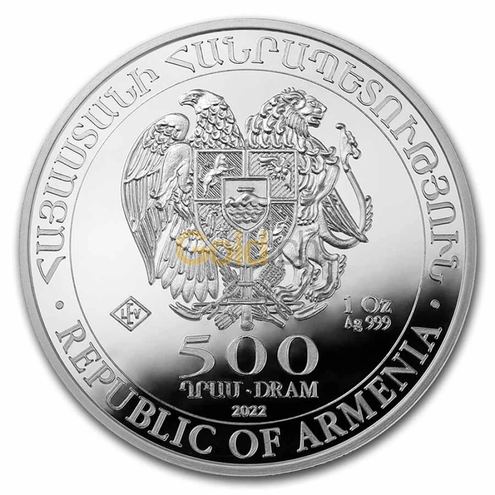 Auf der vorderen Seite der Münze ist das Staatswappen des Landes Armenien zu sehen. Das beeindruckende Emblem der Republik Armenien besteht aus dem Wappen - ein viergeteiltes Schild – welches von zwei Wappentieren getragen wird: dem Adler zur Linken und dem Löwen zur rechten Seite. Am Rande der Münze verläuft ein armenischer Schriftzug und im unteren Drittel steht die englische Übersetzung geschrieben: „REPUBLIC OF ARMENIA“. Im unteren Drittel der Münze findet sich der Nennwert (500 Dram), darunter das Prägejahr und die Reinheit des Edelmetalls über dem Feingewicht.