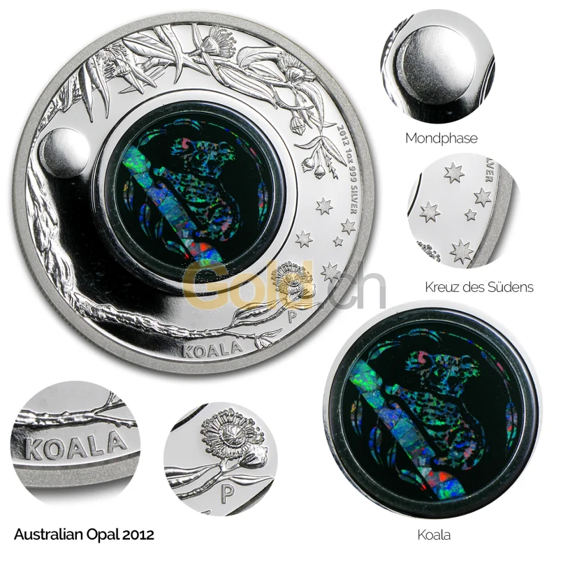 Die Rückseite der ersten Silbermünze der „Australian Opal“-Serie zeigt einen Koala. Das nachtaktive Tier besteht aus mosaikhaft zusammengelegten Opalen, die ihre bunten Farben reflektieren. Der Koala ist an einem Stamm festgekrallt und blickt zum Betrachter. Im inneren des Motivkreises verlaufen Eukalyptusblätter, die die Hauptnahrungsquelle des Baumbewohners sind. Der äußere silberne Rand zeigt einen Neumond auf der linken Seite, der von blühendem Eukalyptus umrankt wird. Am rechten Rand entlang verläuft ein dezenter Schriftzug mit Angaben zum Prägejahr, Stückelung, Feingehalt und Materialangabe: „2012 1 oz 999 SILVER“. Daneben sind fünf Sterne abgebildet, die das Kreuz des Südens (engl. „Southern Cross“) symbolisieren. Am unteren Ende der Münze ist der Name des Tieres zu sehen: „KOALA“.