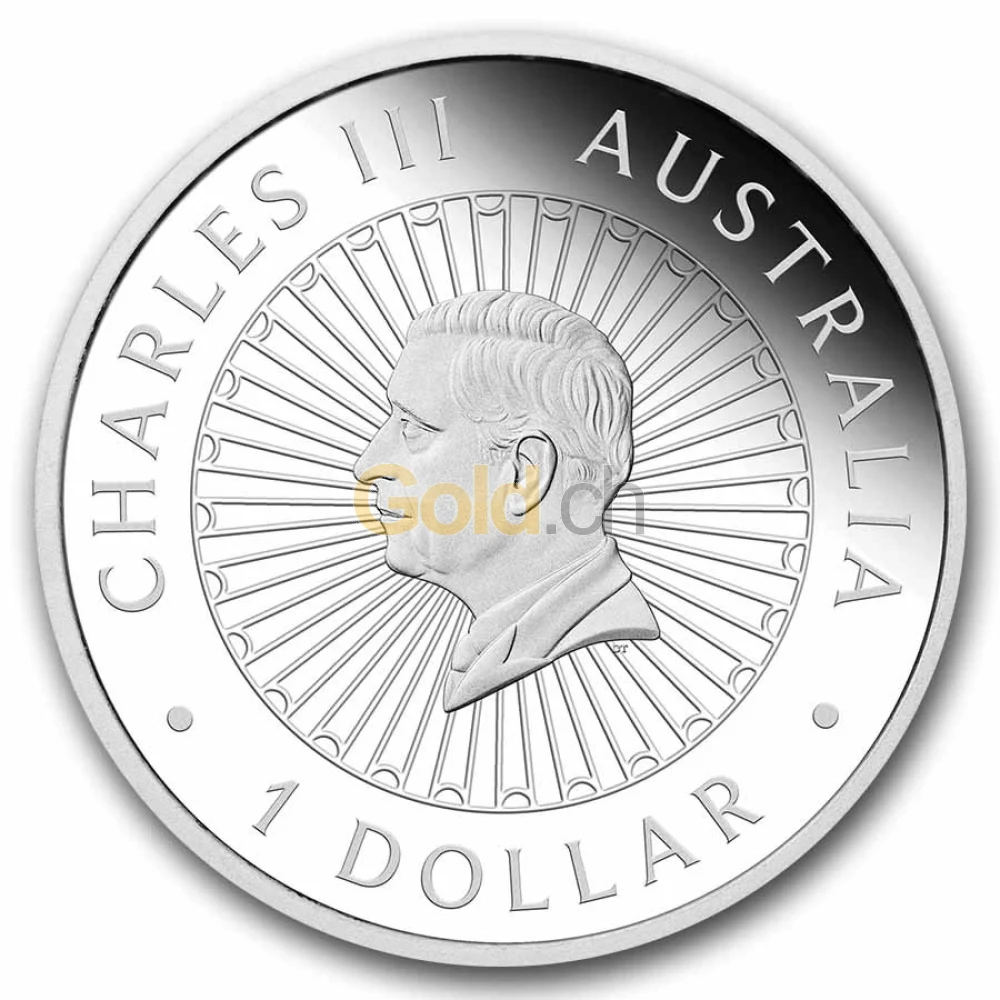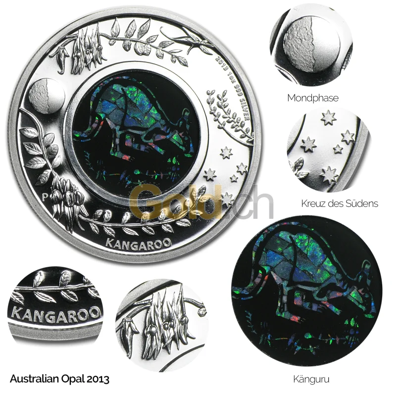 Das Jahr 2013 beginnt mit dem wohl bekanntesten Nationaltier Australiens: dem Känguru. Aus schillernden Opalen zusammen gesetzt grast es auf dem Boden. Im Silberrand der Münze ist die Zierpflanze „Sturt's Desert Pea“ zu sehen, deren Früchte Bohnen tragen. Am rechten Rand des äußeren Silberrings verläuft ein dezenter Schriftzug mit Angaben zum Prägejahr, Stückelung, Feingehalt und Materialangabe: „2013 1 oz 999 SILVER“. Darunter ist das Sternbild „Kreuz des Südens“ (engl. „Southern Cross“) zu sehen, das nur in der südlichen Hemisphäre sichtbar ist. Links steht ein Halbmond und am unteren Rand der Münze ist die englische Bezeichnung des Tieres abzulesen: „KANGAROO“.