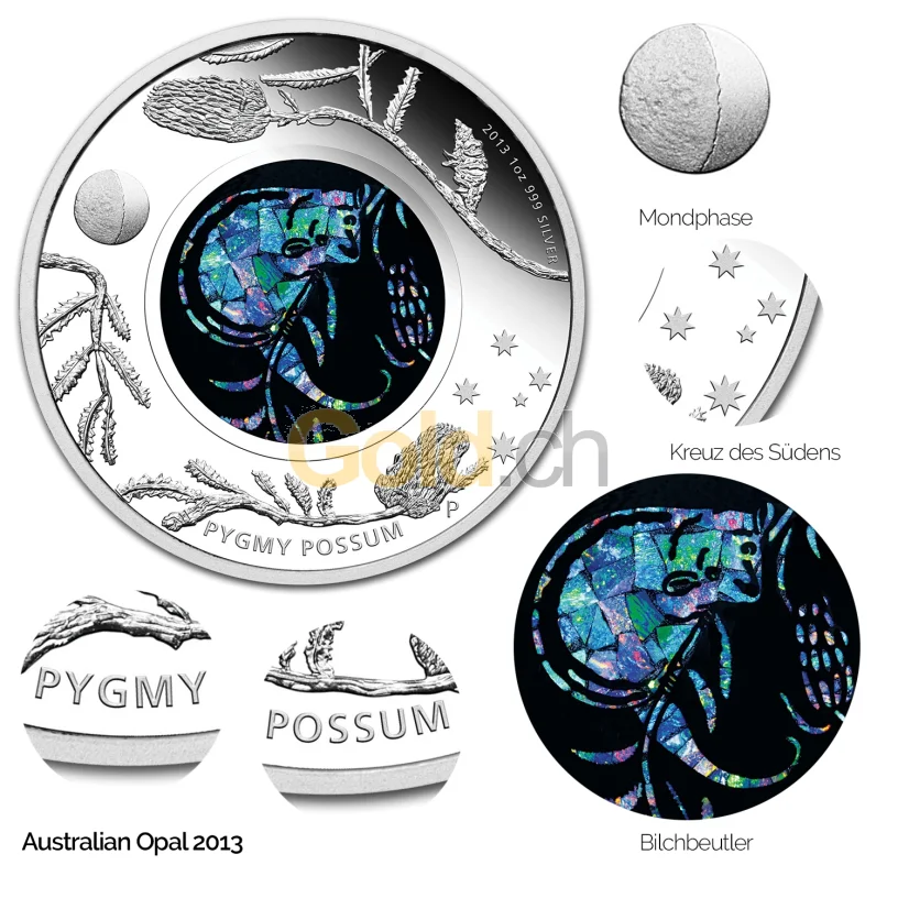 Die zweite Silbermünze der „Australian Opal“-Serie im Jahr 2013 zeigt das Motiv des Bilchbeutlers (engl. „Pygmy Possum“), der wie in der Mitte der Münze zu sehen, vorwiegend auf Bäumen lebt. Das Tier ähnelt im Aussehen einem Siebenschläfer. Im Silberrand ist ein zunehmender Dreiviertelmond zu sehen. Von dort ranken sich Banksien und deren Blüten um den Rand. Rechts ist der Schriftzug zum Prägejahr, der Stückelung und dem Silbergehalt der Münze abzulesen: „2013 1oz 999 SILVER“. Darunter stehen die fünf Sterne des Kreuzes des Südens. Am unteren Rand ist der englische Name des Bilchbeutlers abzulesen: „PYGMY POSSUM“.