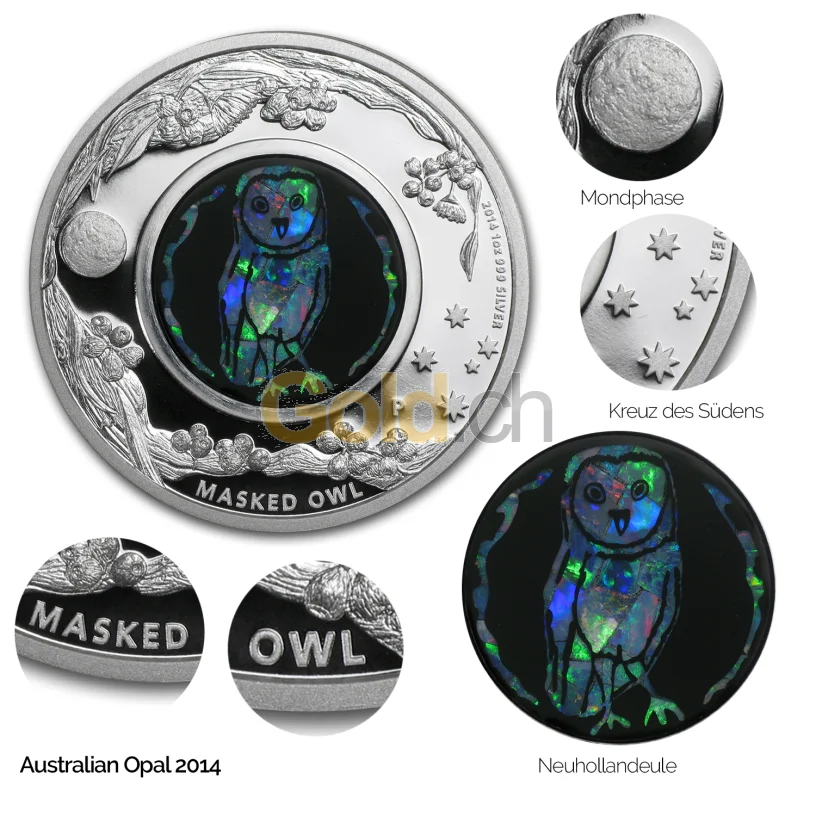 Im Jahr 2014 erschien als zweites Motiv der „Australia Opal“-Serie eine Eule in der mit Opal ausgelegten Mitte der Münze. Die Neuhollandeule ist aus australischen Opalsteinen gelegt und links und rechts durch schlangenförmige Linien verziert. Im äußeren Bereich der Silbermünze sind australische Blütenpflanzen und Eukalyptusblätter zu sehen. Links steht ein abnehmender Dreiviertelmond und auf der gegenüberliegenden Seite sind die Angaben zur Silbermünze abzulesen: „2014 1 oz 999 SILVER“. Darunter steht das Sternbild „Southern Cross“ (Kreuz des Südens) und am unteren Ende ist der englische Name des Vogels zu sehen: „MASKED OWL“, was wörtlich maskierte Eule bedeutet.