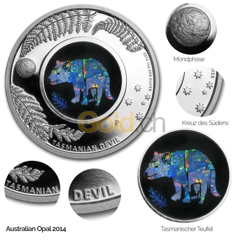 Die erste Silbermünze der „Australian Opal“-Serie aus dem Jahr 2014 bildet den Tasmanischen Teufel als zentrales Motiv ab. Das Beuteltier ist aus purem Opal gelegt und ist zu erkennen durch die Umrisse und die detailliert dargestellte Kopfregion. Neben dem Tier ist ein Farnblatt aus Opalstein abgebildet. Im Silberrand ist ein Vollmond zu sehen, von dem aus sich die in Australien vorkommenden Baumfarne ranken. Am rechten Rand verläuft der Schriftzug mit Angaben zum Prägejahr, Stückelung, Feingehalt und Materialangabe: „2014 1 oz 999 SILVER“. Neben dem Sternbild „Southern Cross“ (Kreuz des Südens) steht am unteren Rand der Münze der Name des Beutelsäugers: „TASMANIAN DEVIL“.