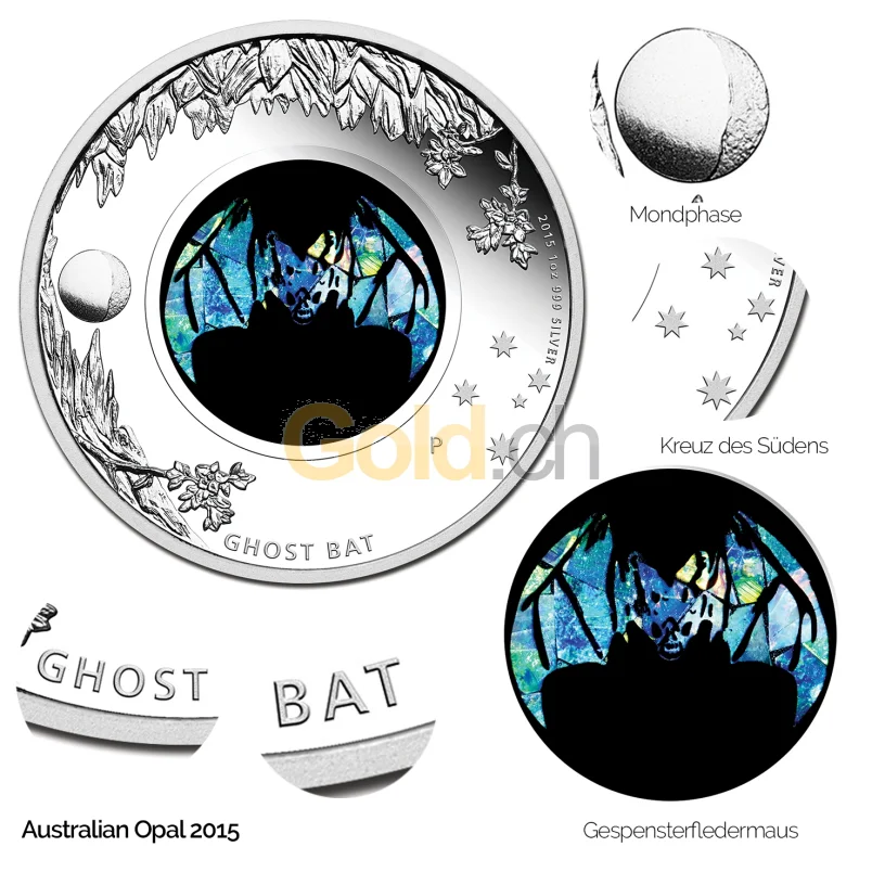 Die faszinierende Münzserie „Australia Opal“ schließt im Jahr 2015 mit dem Motiv einer Fledermaus ab. Dabei handelt es sich um die sogenannte Australische Gespenstfledermaus (engl. „Ghost Bat“). Sie ist mit ausgebreiteten Flügeln dargestellt und ihr Kopf befindet sich in der Mitte der Münze. Im äußeren Rand ist links ein aufgehender Dreiviertelmond zu sehen, der von den felsigen Wänden einer verschachtelten Höhe umgeben ist. Des Weiteren sind die schönen Blüten von Flaschenbäumen abgebildet. Am rechten Rand verläuft ein dezenter Schriftzug mit Angaben zum Prägejahr, Stückelung, Feingehalt und Materialangabe: „2015 1 oz 999 SILVER“. Darunter sind fünf Sterne abgebildet, die das Kreuz des Südens (engl. „Southern Cross“) symbolisieren.