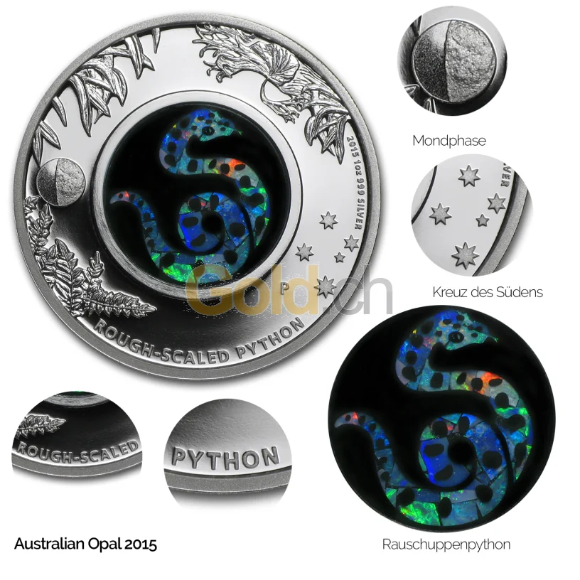 Im Jahr 2015 erscheint erstmals eine Schlange: die Rauschuppenpython. Das einzigartige Muster der Schlange ist mit abwechselnd buntem und schwarzem Opal in die Mitte der Silbermünze gelegt. Im Rand erscheinen Farnblätter und weitere Pflanzen der Flora Australiens, sowie ein abnehmender Dreiviertelmond. Am rechten Rand stehen das Prägejahr und der Feingehalt des Materials: „2015 999 SILVER“. Unter dem Motivkreis ist die englische Bezeichnung der Schlange abzulesen: „ROUGH-SCALED PYTHON“.