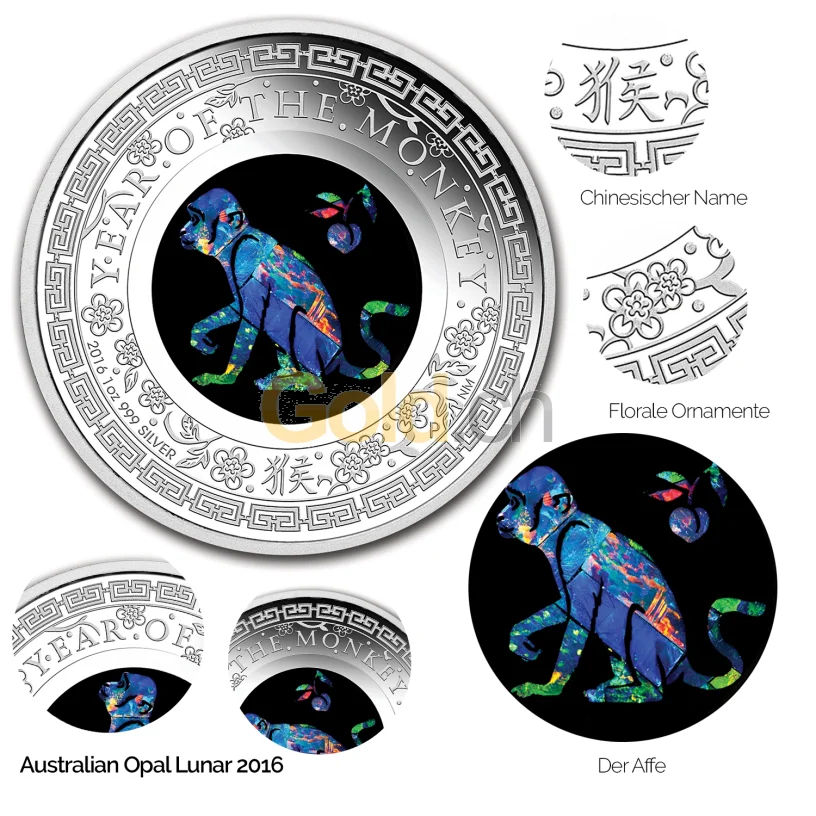 Im Jahr 2016 erschien das erste Motiv der Serie „Australian Opal Lunar“, die den chinesischen Mondkalender zum Thema hat. Das Jahr des Affen (engl. „YEAR OF THE MONKEY“) ist auf dieser Silbermünze durch einen aus Opalsteinen gelegten Affen zu sehen. Rechts über dem Primaten ist ein am Ast hängender Pfirsich, der als Symbol für Langlebigkeit und Unsterblichkeit gilt, zu sehen. In dem silbernen Ring um den Motivkreis sind weitere Abbildungen von Pfirsichblüten zu sehen. Das Tierkreiszeichen Affe steht für Intelligenz und Neugier.