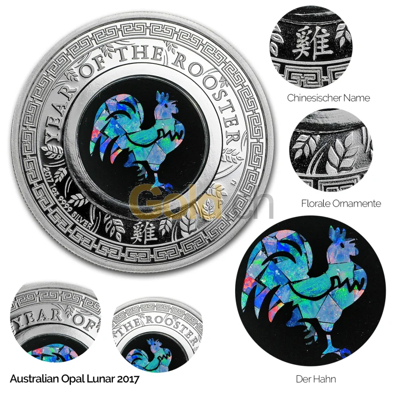 Im Jahr 2017 erschien eine neue Silbermünze der „Australian Opal Lunar“-Serie zum chinesischen Jahr des Hahns (engl. „YEAR OF THE ROOSTER“). Mit Opalen, die auf den ersten Blick vorwiegend bläulich erscheinen, ist ein krähender Hahn abgebildet. In dem silbernen Ring um den Motivkreis sind Blätter und Gräser zu sehen. Der Hahn steht für ein schillerndes Leben und Loyalität.