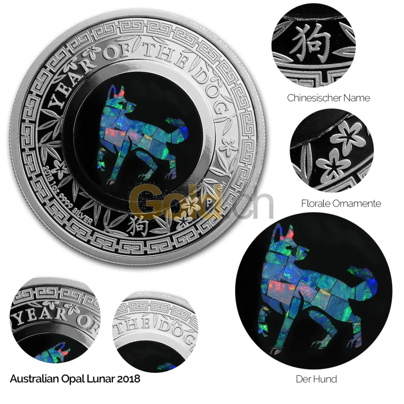 Im Jahr 2018 erschien eine neue Silbermünze der „Australian Opal Lunar“-Serie zum chinesischen Jahr des Hundes (engl. „YEAR OF THE DOG“ und zeigt einen aus Opalsteinen gestalteten Hund. Im Silberrand der Münze sind von Außen nach innen chinesische Ornamente zu sehen, die an florale Verzierungen anschließen. Der englische Name der Münze schwebt über dem Motiv und darunter ist der Name, als chinesischen Zeichen abgebildet. Links davon sind die Angaben zur Silbermünze abzulesen: „2018 1 oz 999 SILVER“. Menschen, die im chinesischen Jahr des Hundes geboren sind, sind aufrichtig und handeln mit hoher Moral.