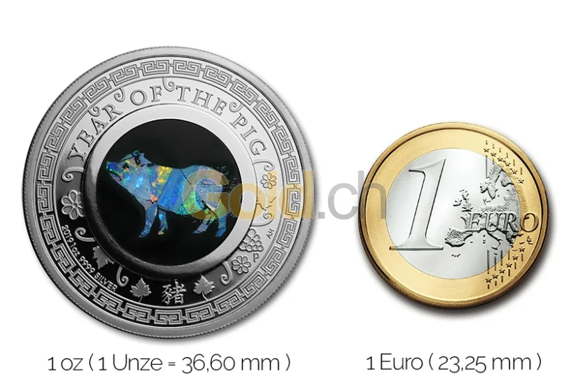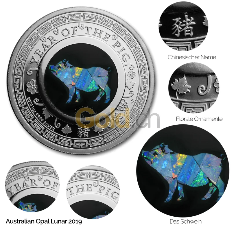 2019 erschien eine neue Silbermünze der „Australian Opal Lunar“-Serie zum chinesischen Jahr des Schweins (engl. „YEAR OF THE PIG“). In der Mitte ist das von der Seite dargestellte Schwein zu sehen. In dem Ring um das Tier steht der Name der Münze neben verschiedenen Darstellungen von Pflanzen. Darunter sind Weinblätter und Trauben zu sehen. Das chinesische Jahr des Schweins sagt Personen dieses Jahrgangs nach sie seien verantwortungsbewusst und gutmütig.