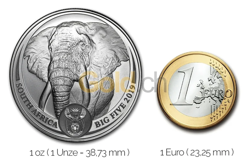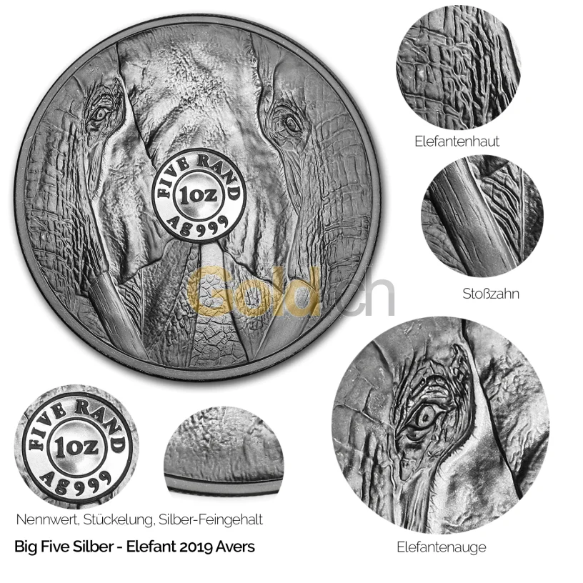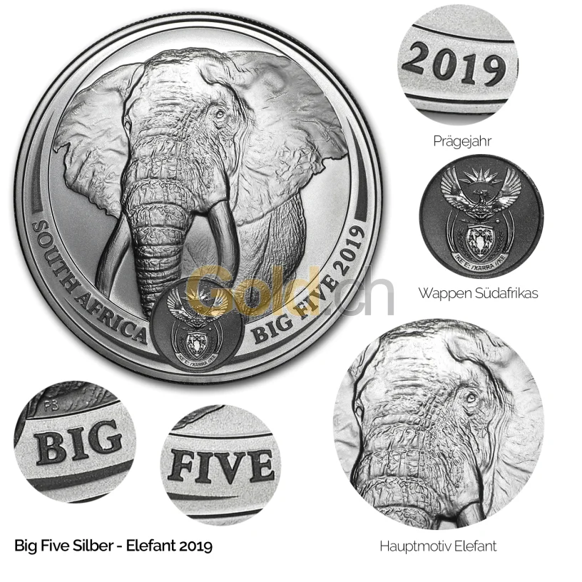 Im Februar 2019 erschien die erste Silbermünze aus der „Big Five“-Serie. Die Serie aus dem Hause der Prägeanstalt „South African Mint“ ist fünf Wildtieren aus den Regionen Südafrika gewidmet. Mit jeder Münze erscheint ein neues Tier auf der hochwertig geprägten Silbermünze. Die erste Münze würdigt den Elefanten mit zwei Darstellungen des Tieres auf der Vorder- und Rückseite. Das erste Motiv der Serie ist in einer Stückelung zu einer Feinunze (1 oz) zu erwerben. Der Feingehalt entspricht 99,9 % purem Silber und der Nennwert der Münze beträgt 5 Rand. Der Rand um die Münze herum ist geriffelt. Die Limitierung des ersten Motivs beschränkt sich auf 15.000 Stück. Die erste Ausgabe der „Big Five“-Serie bietet eine einmalige Gelegenheit, um eine neue Münzkollektion zu beginnen. Doch auch als Anlagemünze eignet sie sich optimal.