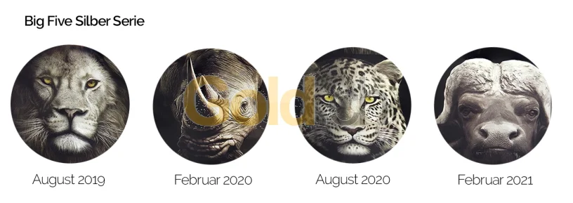 Die „Big Five“-Serie aus dem Hause der „South African Mint“ erschien mit ihrem ersten Motiv, dem Elefanten, Anfang des Jahres 2019. Weitere vier Motive aus der südafrikanischen Tierwelt ergänzen die Serie halbjährlich. Darunter der Löwe, das Nashorn, der Leopard und der Büffel.