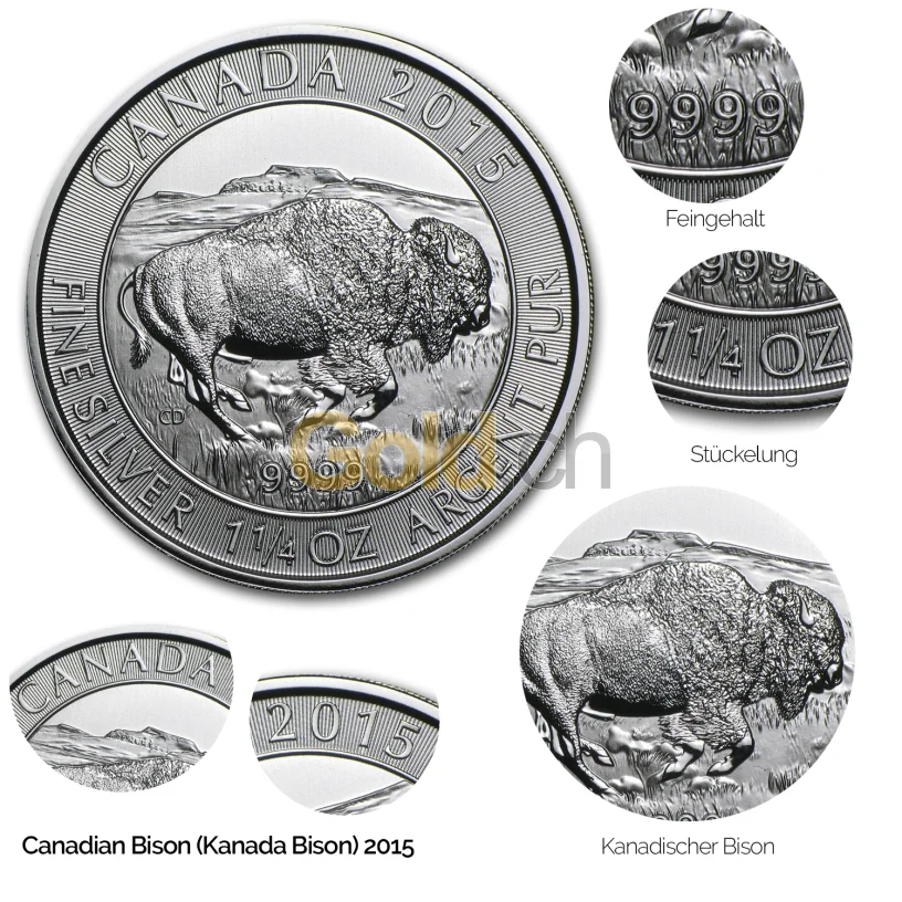 Im Jahre 2015 erschien die erste Silbermünze „Canadian Bison“ (dt., Kanada Bison), die im darauffolgenden Jahr um ein weiteres Motiv ergänzt wurde. Die Anlagemünze stammt aus dem Hause der Royal Canadian Mint. Auf ihr ist das Motiv eines galoppierenden Bisons zu sehen. Das Besondere an dieser Silbermünze ist die Stückelung, die 1 ¼ oz entspricht. Sie enthält 99,99 % reines Silber (Ag). Der Nennwert der Anlagemünze ist auf der Vorderseite unter dem Porträt der Königin Elisabeth II. zu sehen und entspricht 8 Kanadischen Dollar. Der Münzrand ist geriffelt. Eine Anzahl von 200.000 Exemplaren verließ jährlich die kanadische Prägeanstalt. Durch die hohe Prägequalität ist die Silbermünze „Canadian Bison“ eine ideale Anlage für Sammler und eignet sich bestens als Investition.