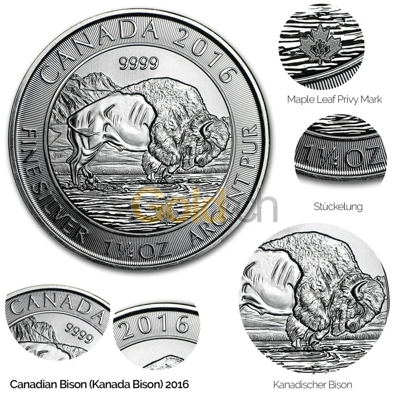 Die Silbermünze „Canadian Bison“ zeigt im Prägejahr 2016 einen Bison, der durch ein Flussbett läuft. Das Tier von gewaltiger Größe watet mit gesenktem Kopf durch die weitläufige Landschaft. Die Silbermünze ist genau so aufgebaut wie das Exemplar aus dem Jahr 2015. Die einzige Neuerung ist das Prägezeichen, das im Wasser unter dem Bison zu sehen ist. Mit der sogenannten Maple Leaf Privy Mark hat die Silbermünze einen zusätzlichen Fälschungsschutz.