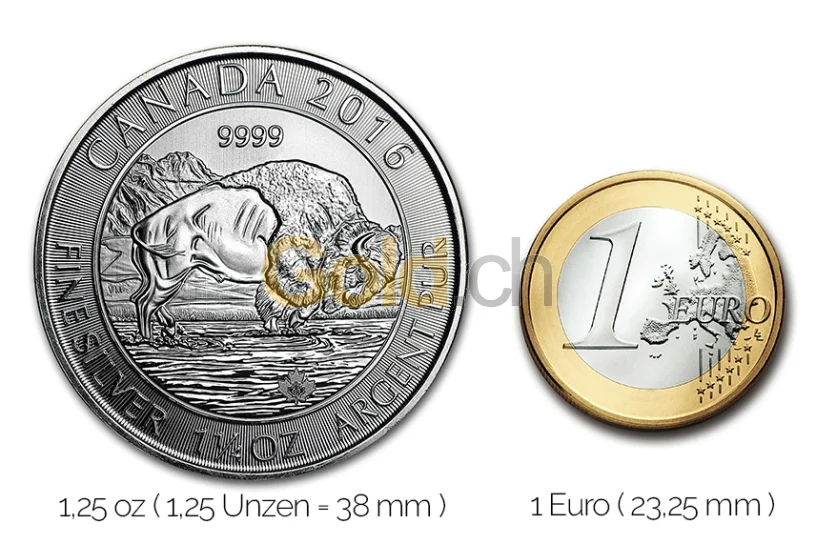Größenvergleich Bison Kanada Silbermünze mit 1 Euro-Stück
