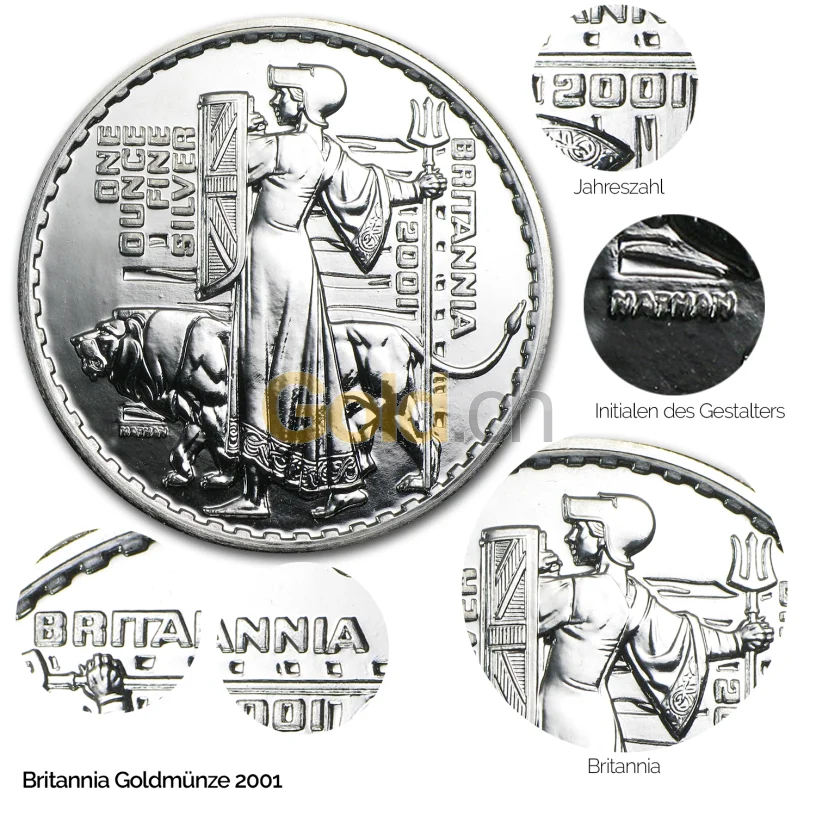 Britannia ist auf der Silbermünze aus dem Jahre 2001 im Profil zu sehen. Rechts steht neben ihr ein Löwe, der in seiner Gestalt an einen englischen Jagdhund erinnert. Britannia hält einen Dreizack in ihrer Hand und das Schild abwehrend vor ihrer Brust. Sie trägt einen modernen Kampfhelm und ebenso deutet die quadratische, serifenlose Schrift auf ein modernes Großbritannien hin.