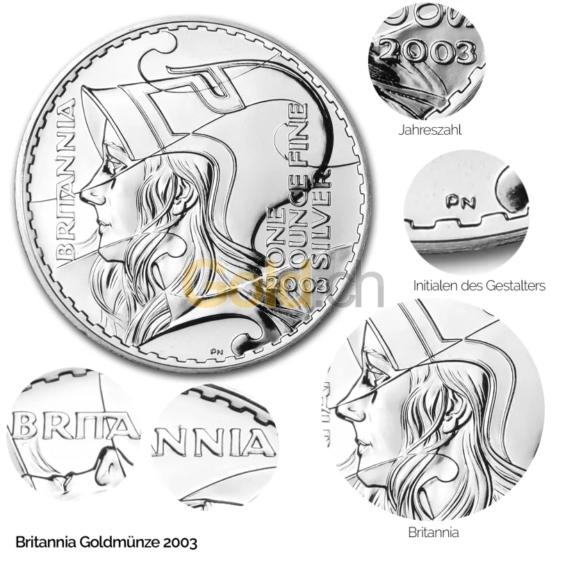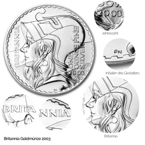 Auf der Silbermünze aus dem Jahre 2003 erscheint die Britannia erstmals als Porträt. Auf ihrem Haupt ist ein römischer Kriegshelm zu sehen und sie blickt zur linken Seite der Münze. Eine wellige Struktur überlagert das Motiv und erinnert an das Meer und somit an ihre Verbundenheit zur Seemacht Britanniens.
