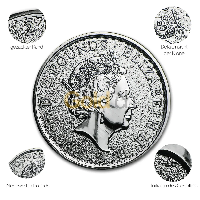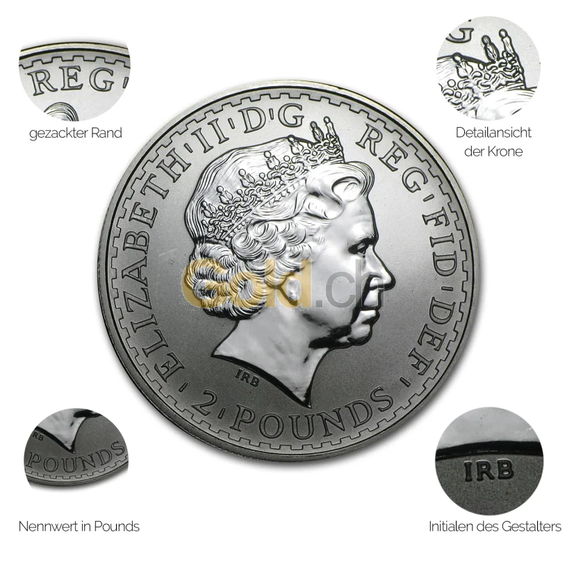 | Motivdarstellung | Vorderseite: Queen Elizabeth II Rückseite: Britannia (wechselnde Motive) |