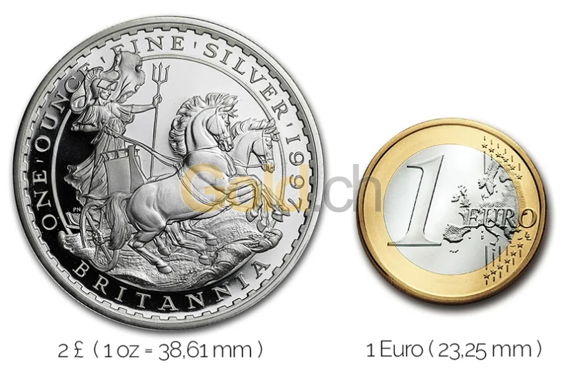 Größenvergleich Britannia Silbermünze mit 1 Euro-Stück