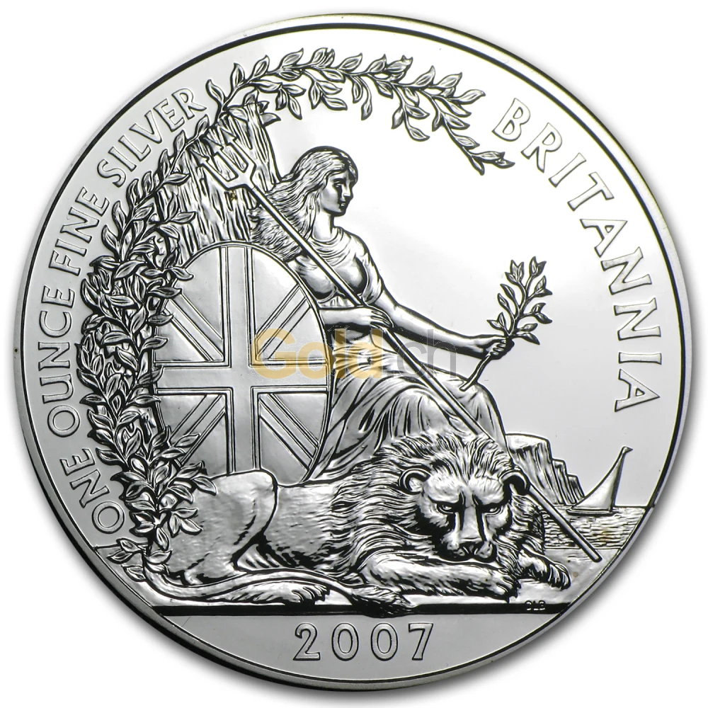 Im Jahre 2007 erschien die Britannia-Silbermünze erstmalig ohne die typische Randverzierung. Hier liegt Britannia am Ufer einer Küstenlandschaft. Zu ihren Füßen bewacht ein Löwe die ruhende Kriegerin. Neben ihrer Rechten steht das Schild mit der britischen Unionsflagge bereit. Sie hält den Dreizack in der rechten Hand und den Olivenzweig in ihrer Linken. Am Horizont ist ein Segelschiff vor der Küste zu sehen. Es segelt auf dem Meer im Hintergrund der Münze auf die schützende Britannia zu. Der bekannte Künstler Christopher Le Brun erhielt den Auftrag zur Gestaltung dieser Silbermünze.