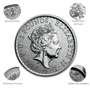 Für diese Darstellung der Britannia wählte die Royal Mint die Bildhauerin Suzie Zamit aus. Der einmalige handschriftliche Charakter der Illustration springt hier ins Auge. Der Stil, in welcher die Britannia dargestellt ist, erinnert an die französischen Silbermünzen des frühen 20. Jahrhunderts. Nun findet sich diese Zeichenart auf der Britannia-Silbermünze wieder. Auf der Silbermünze ist das Porträt der Britannia mit einem Löwenkopf als Kriegshelm zu sehen. Mit stählernem Blick sieht sie in die Ferne. Unter ihrem Halse steht die Jahreszahl, die von Olivenblättern umrahmt ist.