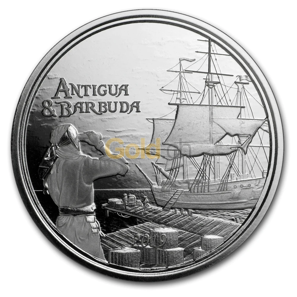 Die Silbermünze „Antigua & Barbuda“ aus dem Jahre 2019 erzählt eine Geschichte über die Rumexporte der Karibikinseln Antigua und Baruda. Sie zeigt einen Piraten, der das Beladen eines Schiffs mit Rumfässern beobachtet. Der Seemann ist auf der linken Seite der Münze von hinten zu sehen, wie er mit seinem Fernglas in die Richtung des Piratenschiffs blickt. Der Dreimaster liegt an einem Steg und die Mannschaft bewegt die Fässer über eine Rampe an Board.