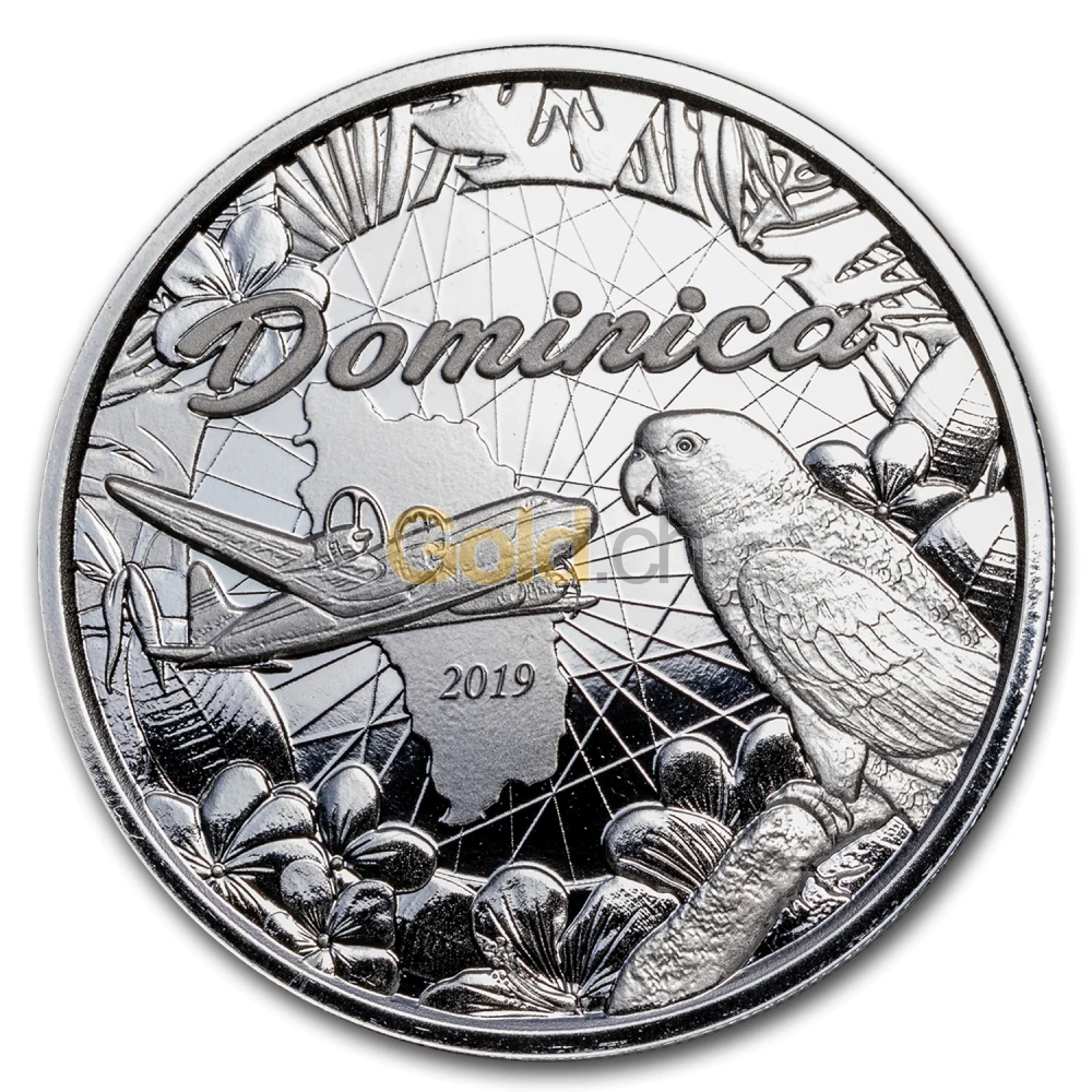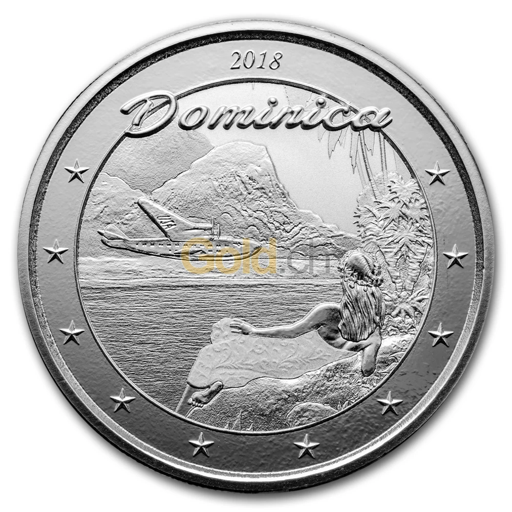 Auf der Rückseite der dritten Ausgabe der EC8-Serie ist eine Frau zu sehen, die von der Insel aus, ein landendes Wasserflugzeug beobachtet. Hinter dem Flugzeug sind die Berge der Insel Dominica zu sehen, die vor Tausenden von Jahren aus Vulkanstein entstanden ist. Dominica ist bekannt für seine atemberaubende Naturlandschaft, die auf der Silbermünze zu erahnen ist.