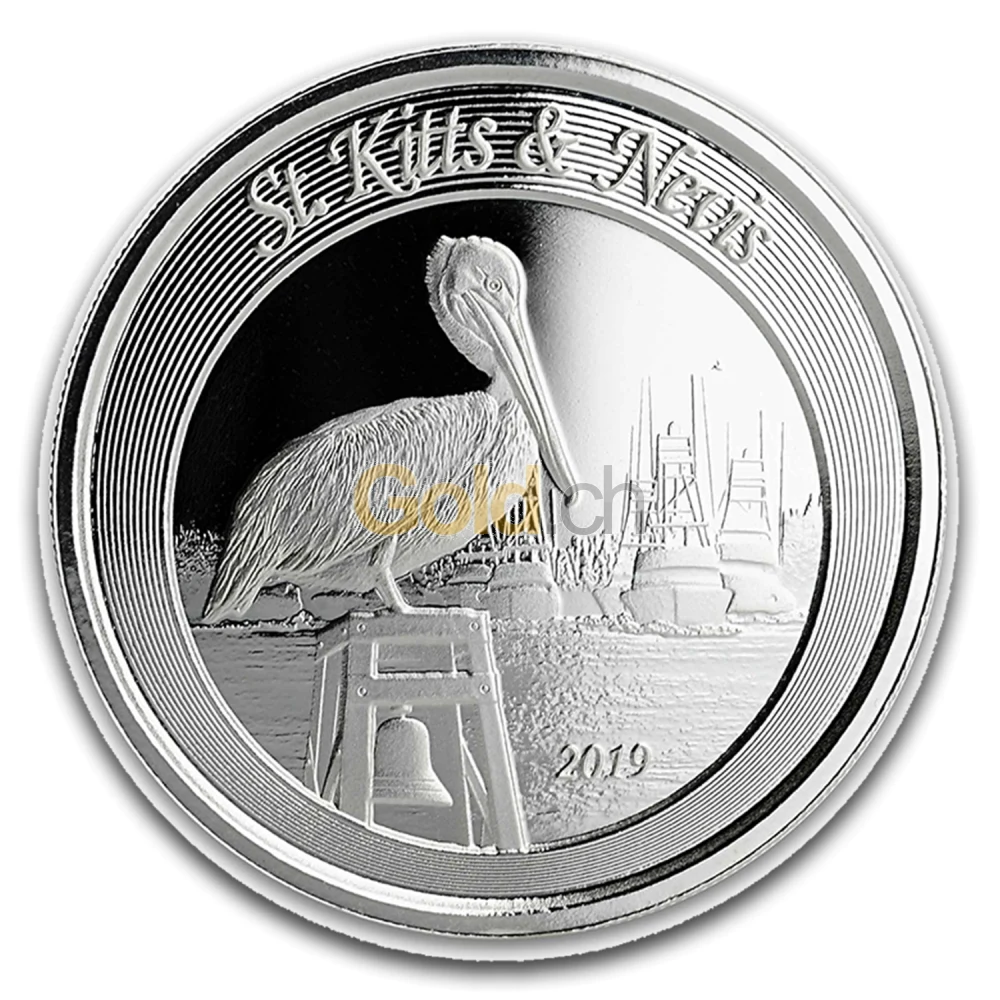Im Jahr 2019 erschien die Silbermünze „St. Kitts & Nevis” mit einem neuen Motiv. Der Pelikan sitzt auf einer Boje mit einer Glocke und hinter ihm sind viele Schiffe, die im Hafen liegen zu sehen. Sein langer Schnabel ist nach unten gerichtet und der Vogel ist seitlich abgebildet.
