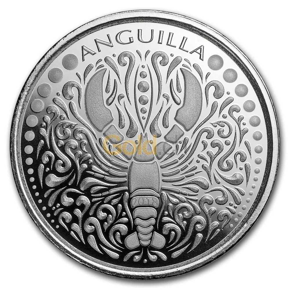 Auf der sechsten Silbermünze der Serie „EC8“ ist der Körper eines großen Hummers zu sehen. Die Illustration des Hummers liegt auf der senkrechten Mittelachse der Münze und ist umgeben von einer Vielzahl von Ornamenten. Über der Darstellung ist der Name der Insel abzulesen „Anguilla“. Die Karibikinsel Anguilla ist bekannt für ihre kulinarischen Besonderheiten. Darunter fällt der Hummer, der seit Jahrhunderten wichtiger Teil der Wirtschaft ist und in andere Teile der Karibik, sowie die USA exportiert wird. Neben dem Fischen ist heute der Tourismus eines der Hauptstandbeine der Insel.