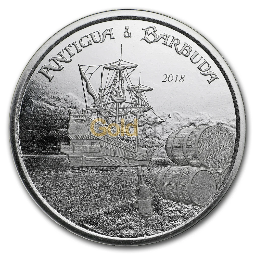 Die erste Silbermünze aus dem Jahre 2018 zeigt ein beeindruckendes Segelschiff am Horizont der Karibikinseln. Im Vordergrund ist ein Stück Land zu sehen, wo eine Flasche Rum neben drei Holzfässern zu sehen ist. Dank ihrer üppigen Rohrzuckervorkommen sind Antigua und Barbuda bekannt für ihre Rumproduktion und Überseeexporte von Rum vom 17. Jahrhundert an. Bis heute findet sich auf den Inseln eine breite Auswahl an feinsten Rumsorten.
