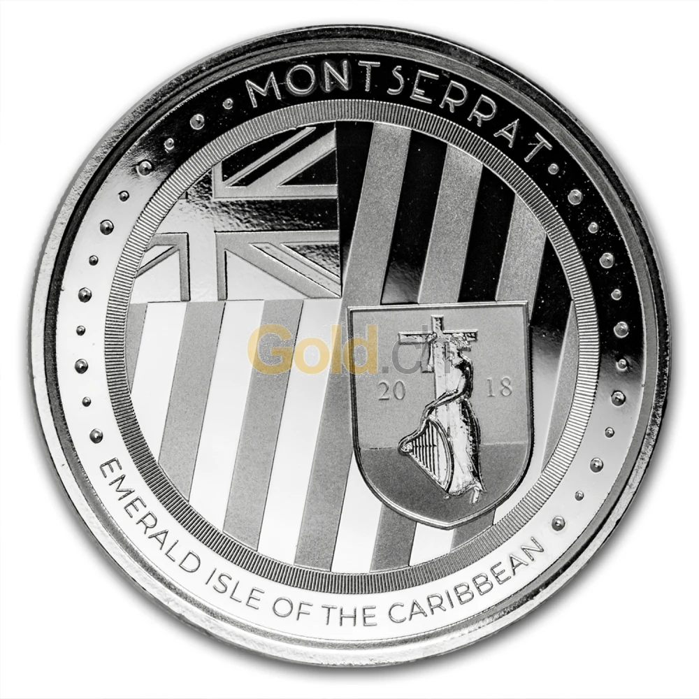 Auf der Rückseite der fünften Silbermünze aus der Serie. Montserrat ist Teil der Leeward Inseln in der Ostkaribik, die wiederum zu den „Kleinen Antillen“ gehört. Es handelt sich um ein Überseegebiet des Vereinigten Königreichs. Auf der Silbermünze ist das Wappen Montserrats abgebildet. Auf einem gestreiften Hintergrund liegen die britische Flagge und das Wappen Montserrats. Auf dem Wappen ist die Jahreszahl „2018“ zu sehen und eine Frau in einem langen Gewand, die ein Kreuz in ihrem rechten Arm und eine Harfe in ihrer linken Hand hält.