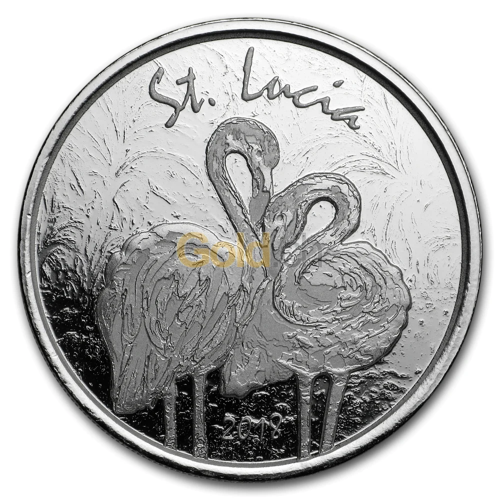 Auf der siebten Ausgabe der „EC8“-Serie ist ein Flamingopärchen abgebildet. Die Paradiesvögel halten ihre Köpfe nebeneinander, sodass ihre Hälse ein Herz bilden. Über den eleganten Wasservögeln ist der Schriftzug St. Lucia zu lesen. Die Insel St. Lucia ist ein beliebter Schauplatz, um unzählige Vogelarten zu beobachten.