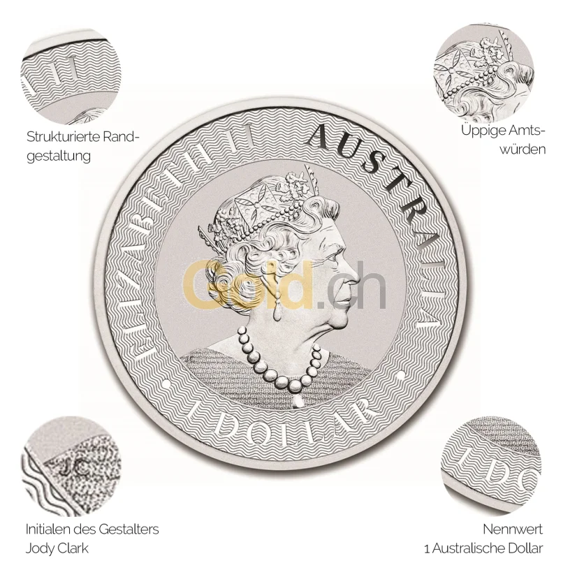 Analog zum Avers findet sich auch hier der breite, wellenförmige Rand. Er trägt im oberen Bereich die Umschrift: »AUSTRALIAN KANGAROO« und ergänzt im Boden das Prägejahr sowie den Feingehalt in Silber. Erst auf dem zweiten Blick wird das dezente Münzzeichen »P« für The Perth Mint erkennbar, das den rechten Rand ziert. Zudem integriert der Revers ein Privy-Mark im ersten A von Australien (mehr dazu im Kapitel Privy-Mark). Auch auf der Rückseite findet sich der schmale Außenring in glatter Ausführung.