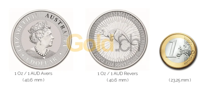 Größenvergleich Australian Kangaroo Silbermünze mit 1 Euro-Stück