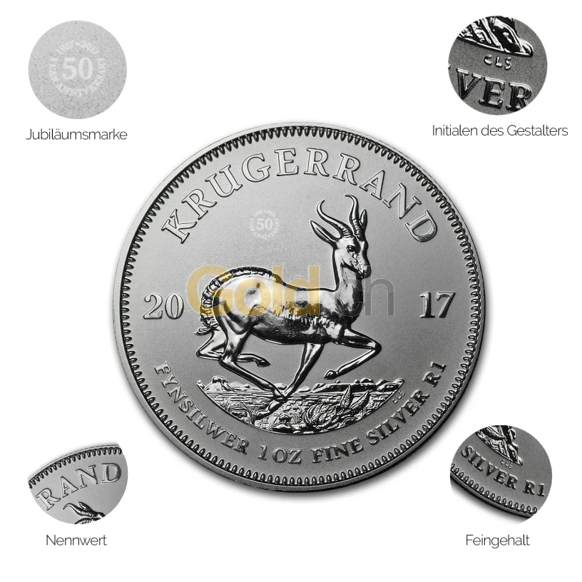 Der Krügerrand (auch Krugerrand) ist bereits seit Jahrzehnten eine der bekanntesten Sammler- und Anlagemünzen. Die erstmals im Jahre 1967 durch die Rand Refinery in der südafrikanischen Stadt Germiston geprägte Goldmünze gilt als die erste Anlagemünze. Mit ihrem 50-jährigen Jubiläum im Jahre 2017 zeigt sie sich erstmalig als Silbermünze (und Platinmünze). Mit einer Limitierung von 1 Mio. Stück erschien sie als (Premium-)Stempelglanz sowie mit 15.000 Stück als Proof-Version und ist somit eine wertvolle Sammlermünze. Sie stammt aus dem Hause der Prägeanstalt Rand Refinery (südlich von Johannesburg) und hat einen Feingehalt von 999.9 und Nennwert von 1 afrikanischen Rand (R1). Ab dem Jahr 2018 erscheint der Silber Krügerrand unlimitiert als Anlagemünze in der Prägequalität Stempelglanz.