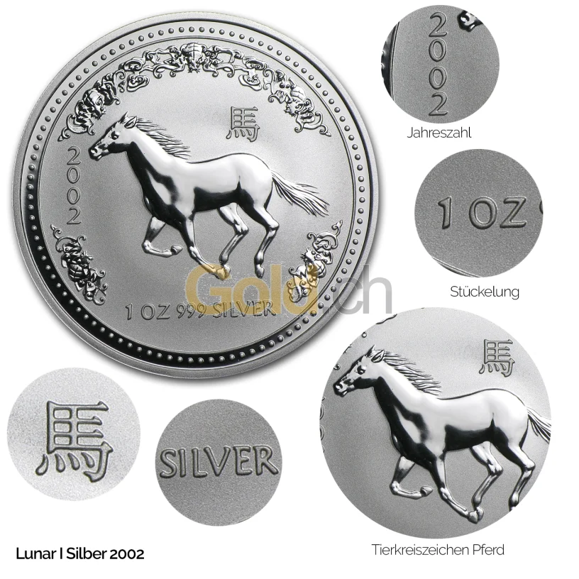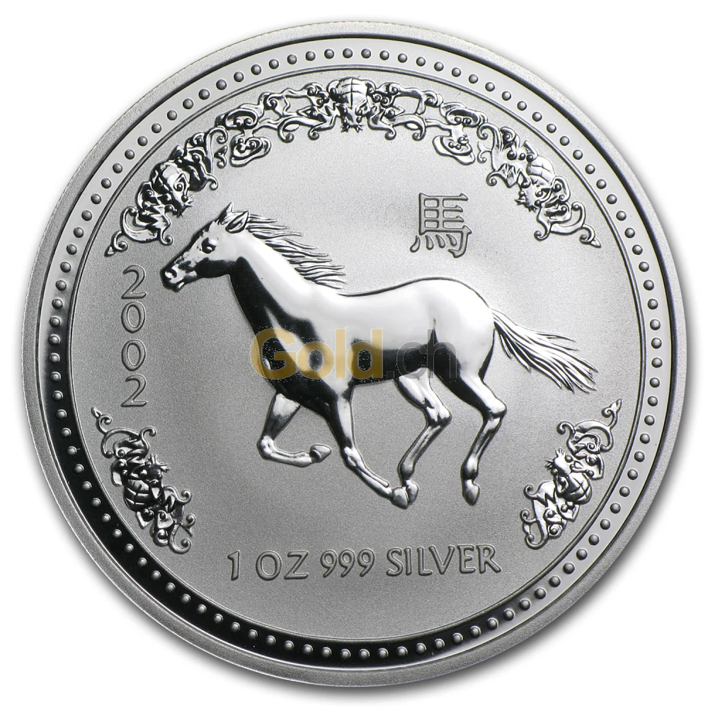 Die Prägung der Lunar-Silbermünze aus dem Jahre 2002 stellt das siebte Tierkreiszeichen des chinesischen Mondkalenders in den Mittelpunkt: das Pferd. Das elegante Tier ist von der Seite zu sehen und nähert sich im Galopp dem linken Rand der Münze. Durch die Schnelligkeit der Bewegung wehen die Mähne und der Schweif des Tieres in der Luft.