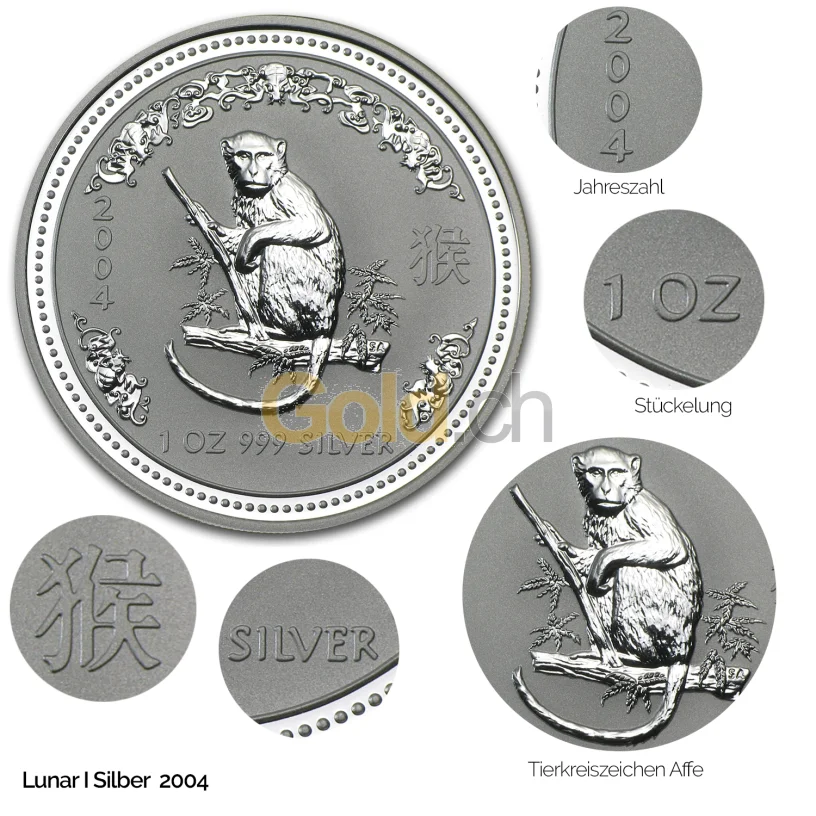 Auf der Silbermünze der Lunar-Serie aus dem Jahre 2004 ist ein sitzender Affe abgebildet. Er hält sich an einem Zweig fest, der von dem Ast abgeht auf dem er sitzt. Der Affe blickt zum Betrachter und ist von einigen Blättern des Baums umgeben.