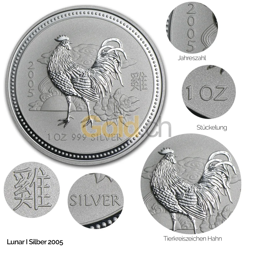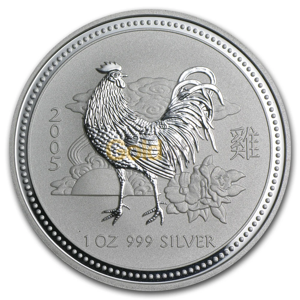 Die Silbermünze der Lunar-Serie aus dem Jahre 2005 zeigt einen stolzen Hahn mit einem eindrucksvollen Federkleid dar. Der stolze Vogel posiert vor diversen Elementen, die auf dem matten Hintergrund der Münze zu sehen sind: eine aufgehenden Sonnen über der eine Wolke schwebt und einem kleinen Bouquet Blumen.