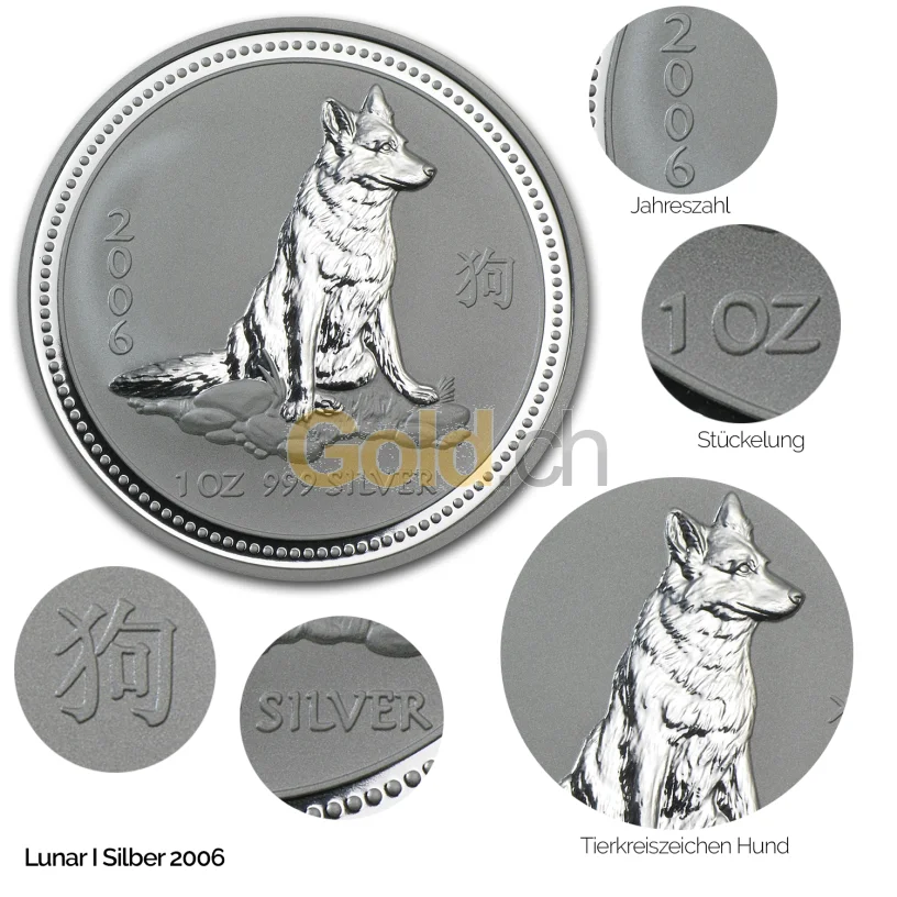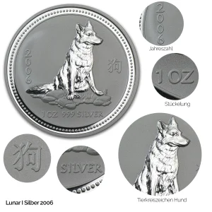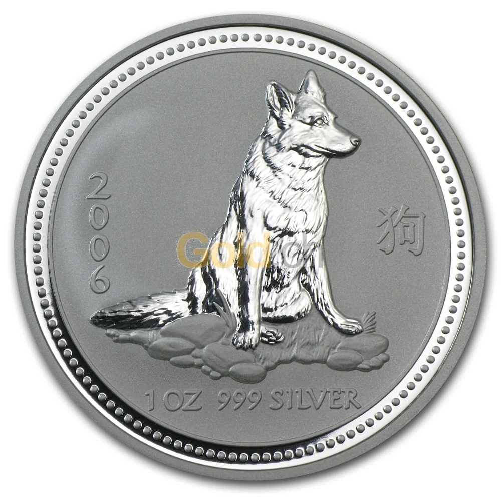Auf der Silbermünze aus dem Jahre 2006 ist der Hund, das elfte Tierkreiszeichen aus dem chinesischen Mondkalender zu sehen. Der dargestellte Hund, erinnert stark an den Ursprung des Tieres: den Wolf. Die Silbermünze zeigt den Wolfshund, auf einem steinigen Stück Erde sitzend und zur rechten Seite der Münze blickend. Die Prägung legt großen Wert auf die Darstellung der Fellstruktur des Tieres, die in vollem Glanz erscheint.