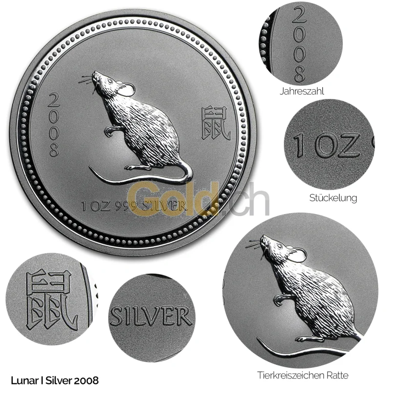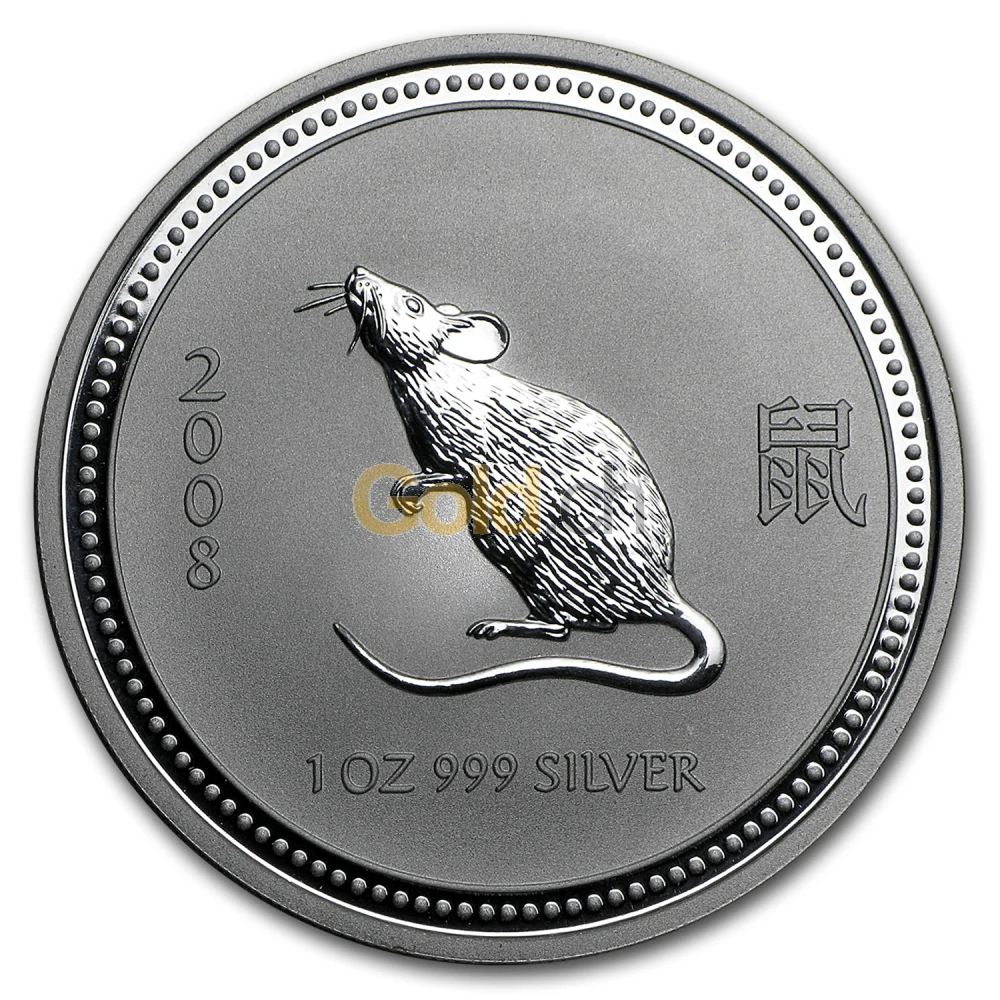 Die Münze der silbernen Lunar-Serie aus dem Jahre 2008 zeigt das Tierkreiszeichen der Ratte. Im chinesischen Kalender gilt die Ratte als positives Tier, das für ihren Erfolg bekannt ist. Die Ratte präsentiert sich auf der Silbermünze als neugieriges Wesen, das mit aufgerichtetem Oberkörper in die Luft schnuppert.