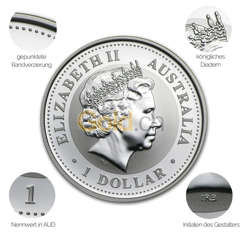 Die Vorderseite der Anlagemünze „Lunar“ aus dem Hause der australischen Prägeanstalt Perth Mint zeigt das Porträt der Königin des Commonwealth: Elisabeth II. Auf der anderen Münzseite ist das jeweilige Tierkreiszeichen des Erscheinungsjahres zu sehen.