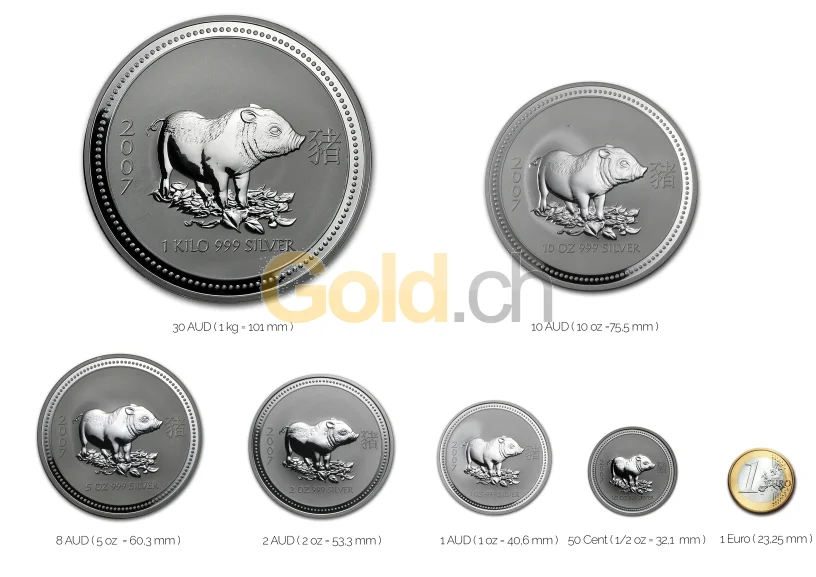 * Um die Silberausgabe mit der früher (1996) gestarteten Gold Lunar-Serie zu synchronisieren, wurden im Jahr 2007 neben dem Schwein noch die Ausgaben Maus (2008), Ochse (2009) und Tiger (2010) ausgegeben. Auf der Kopfseite wurde neben der Queen bei diesen drei Ausgaben jeweils das Jahr 2007 zusätzlich geprägt. (Quelle: Wikipedia)