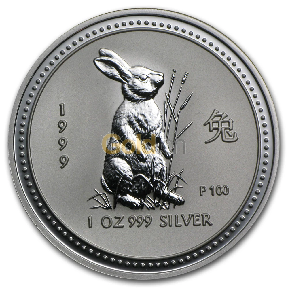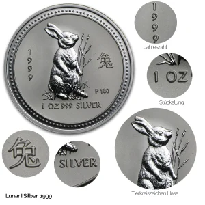 Auf der ersten Ausgabe der silbernen Lunar-Serie ist das Tierkreiszeichen des Jahres 1999 zu sehen. Der Hase ist das vierte Tierkreiszeichen im chinesischen Mondkalender. Auf der Silbermünze steht das Tier auf den Hinterläufen und hält seinen Kopf in Richtung eines Grashalms, der neben ihm steht. Durch die detaillierte Prägung des Motivs fällt der Blick auf die Fellstruktur und die feinen Gräser, in denen der Hase sitzt.