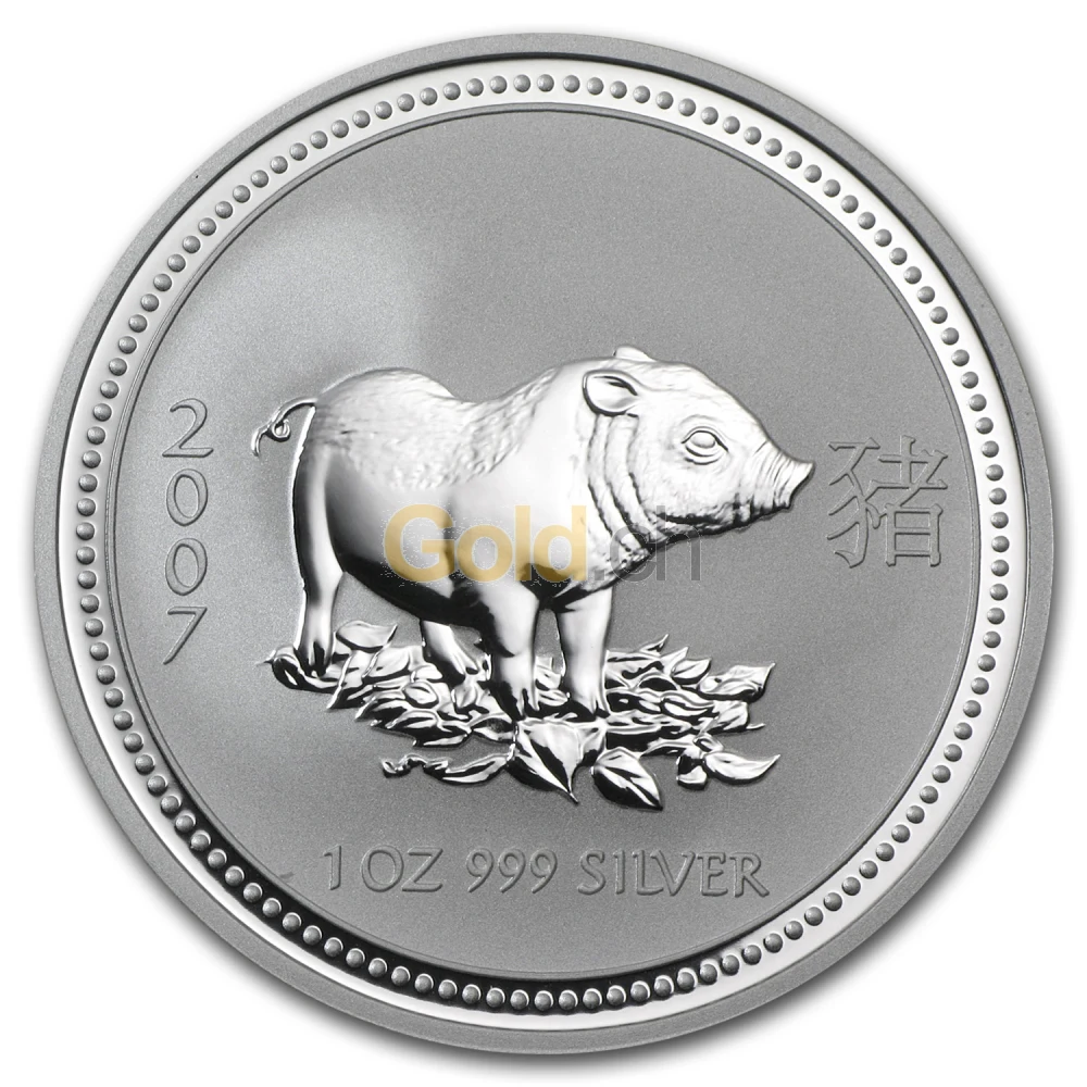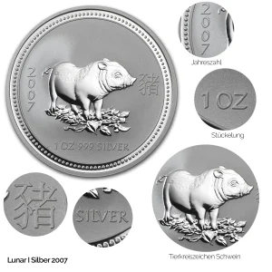 Im Jahre 2007 ist das letzte Tierkreiszeichen des chinesischen Mondkalenders zu sehen: das Schwein. Auf der Silbermünze ist ein kleines Ferkel abgebildet, das in einer Ansammlung Laub steht. Es blickt zur rechten Seite der Münze und sein Rücken ist von einem leichten Flaum bedeckt.