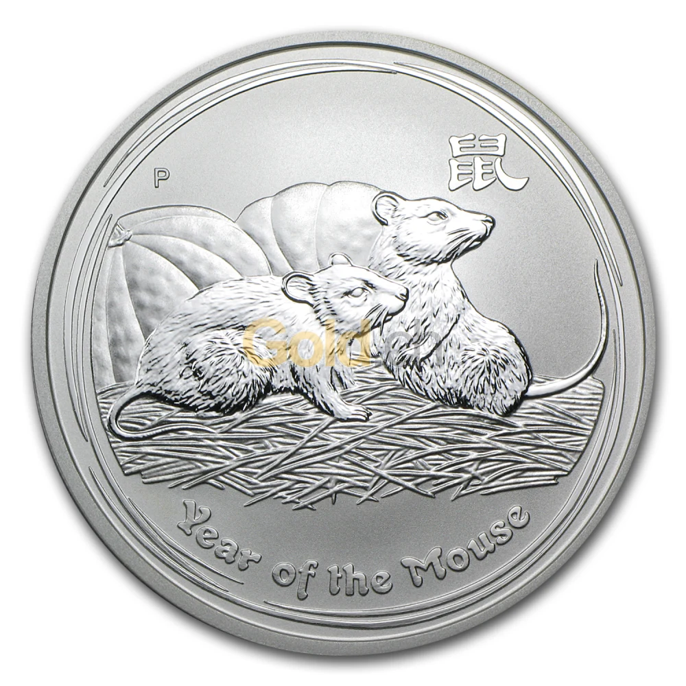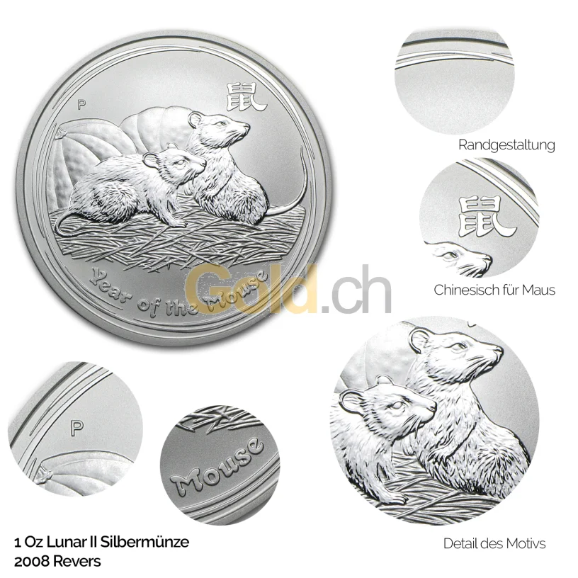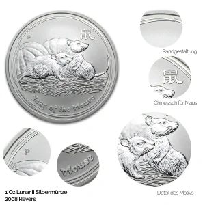 Mit dem Mäusemotiv beginnt 2008 die zweite Serie des Lunarsilbers. Dargestellt sind zwei nach rechts blickende Mäuse, die sich im Stroh befinden. Ganz offensichtlich sind die Nager in ein Erntelager eingebrochen, denn im Hintergrund sind zwei saftige Kürbisfrüchte zu sehen. Der Rest des Lunar II Maus-Revers besitzt einen glatten Untergrund, sodass die Umschrift "Year of the Mouse" am Münzboden, das Münzzeichen P am linken Rand sowie das Han-Wort für Maus oder Ratte am rechten Rand deutlich hervortreten (shŭ = verwegen).