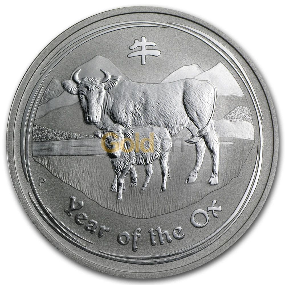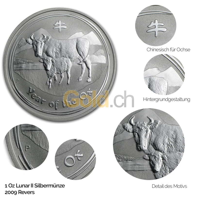 Das Rückseitenmotiv der 2009er Münze zeigt analog zum Mondkalender einen Ochsen mit Jungtier auf der Weide. Die Tiere stehen auf einem Grasstreifen und schauen nach vorne zum Betrachter. Der Gestalter des Lunar II Ochsen hat die Huftiere in einer hügeligen Umgebung dargestellt, mehrere Berge umrahmen sie. Die Bodenbeschriftung "Year of the Ox" ist mit reichlich Platz zum Hauptmotiv am Boden platziert. In Verlängerung nach links befindet sich das Münzzeichen der Perth Mint, während der Kopf der Abbildung vom China-Wort für Ochse, Büffel oder Rind bestimmt wird (niú = sanft).